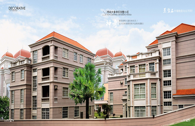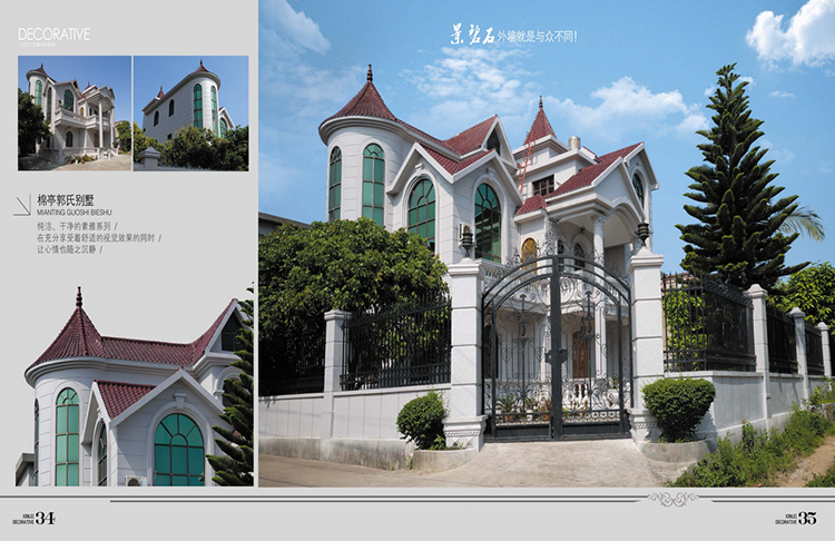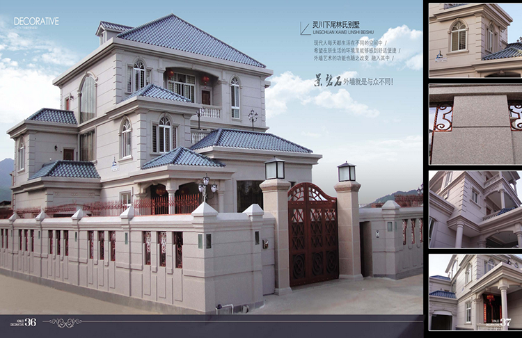 適用于山莊別墅、酒店、賓館、娛樂(lè)場(chǎng)所、商業(yè)會(huì)所等建筑物內(nèi)外墻大面積使用。